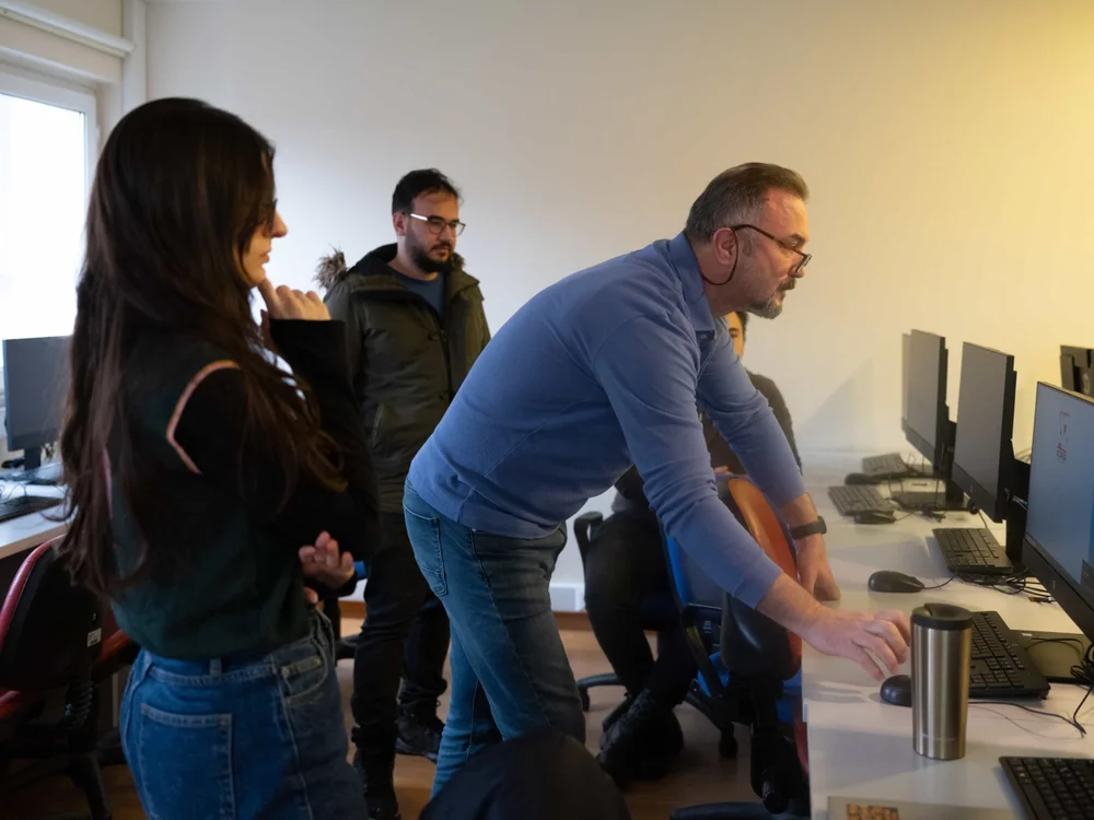 Шахин обсуждает со своими учениками историю машинного перевода.
