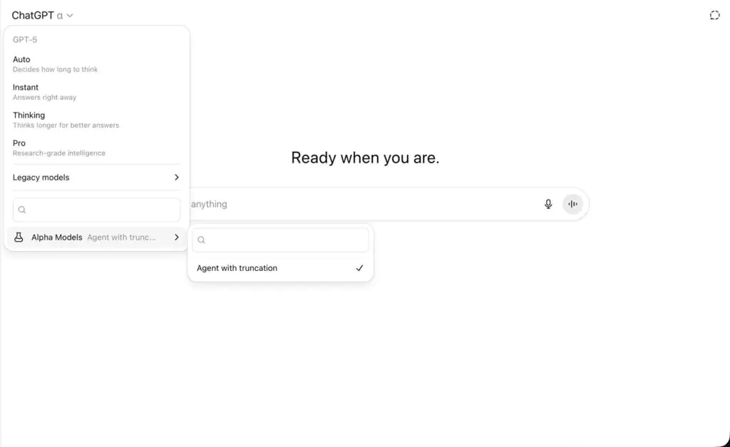 Как видно на скриншоте выше опубликовано в X (https://x.com/ClayMalott/status/1970893595004776456), новая функция называется «Агент с усечением», и её можно найти в разделе «Альфа-модели».