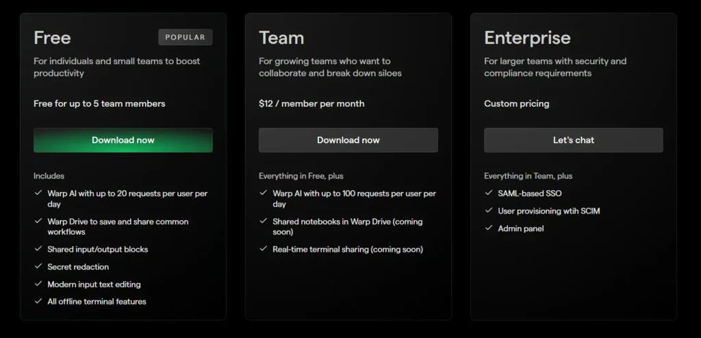Теперь, когда вы перейдете к созданию учетной записи Warp на их веб-сайте, у вас будет возможность выбрать бесплатный тариф, тариф для команды или корпоративный тариф. Бесплатный тариф позволяет вам отправлять 20 запросов Warp AI и работать с 5 участниками команды. В тарифном плане для команды вы сможете отправлять 100 запросов Warp AI без ограничений по количеству участников команды. Наконец, корпоративный тариф больше подходит для корпоративной среды.