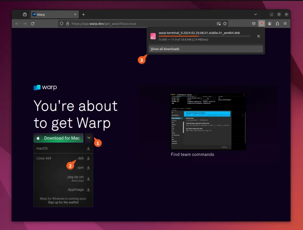 Warp Terminal предлагает дистрибутивы для популярных дистрибутивов Linux, таких как Deb для Debian и Ubuntu, RPM для RedHat и Fedora и PKG для пользователей Arch и Manjaro. Кроме того, вы можете использовать AppImage.