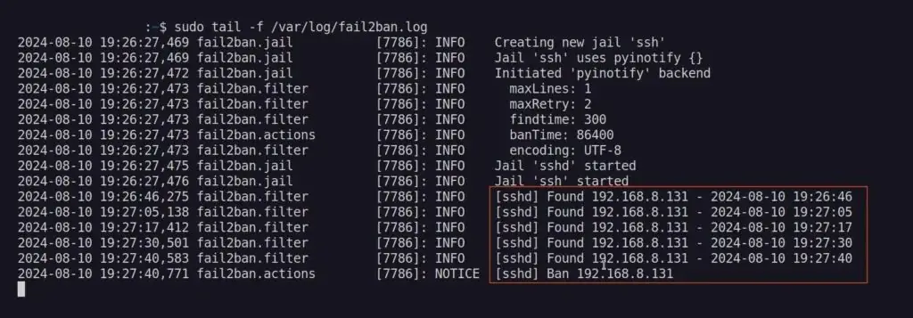 Во время или после неудачных попыток входа в систему вы можете просмотреть журналы Fail2Ban, чтобы узнать, был ли заблокирован IP-адрес.