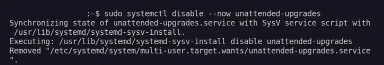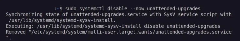 Это немедленно остановит службу автоматических обновлений, предотвратив ее автоматический запуск при загрузке системы. Если вы захотите снова запустить службу автоматических обновлений, выполните команду sudo systemctl enable --now unattended-upgrades .