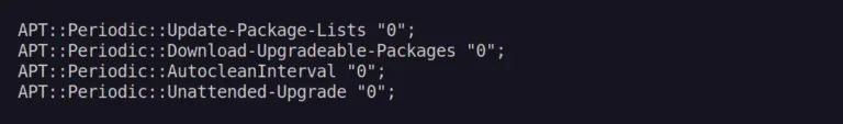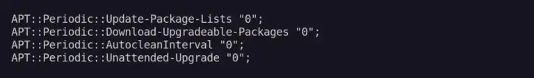 APT::Periodic::Update-Package-Lists "0"; APT::Periodic::Unattended-Upgrade "0";