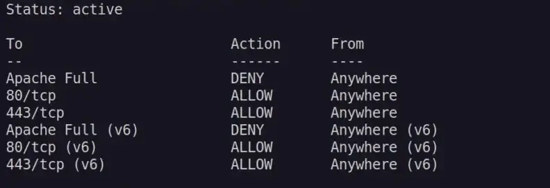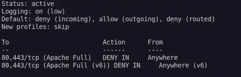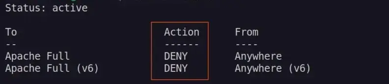 Как видите, мы разрешили доступ через порты 80 и 443. Важно отметить, что хотя для Apache Full по-прежнему установлено значение DENY, конкретные правила ALLOW для портов 80 и 443 переопределяют их и не влияют на нас.