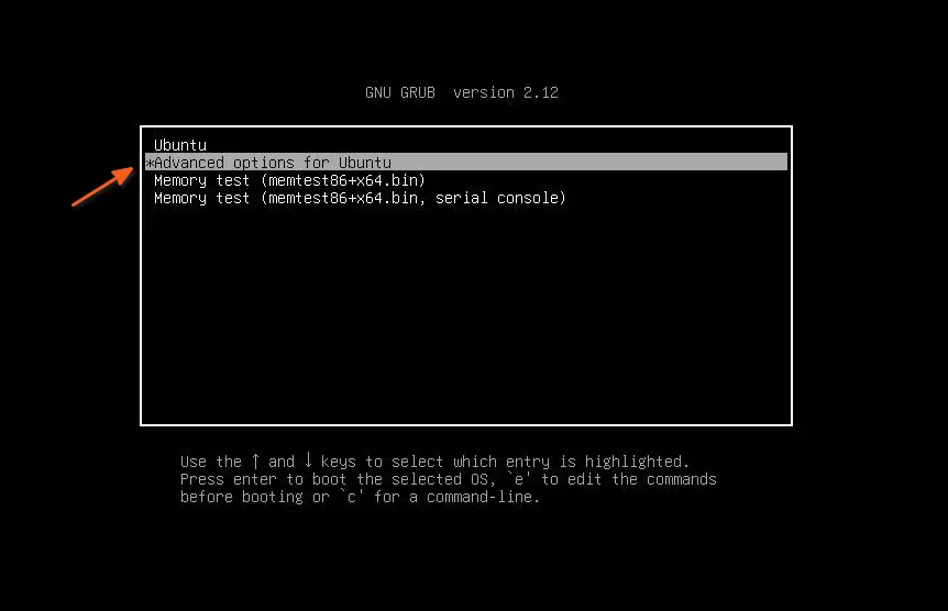 Итак, начните с загрузки системы. Когда появится экран GRUB, с помощью клавиш со стрелками выберите «Дополнительные параметры для Ubuntu».