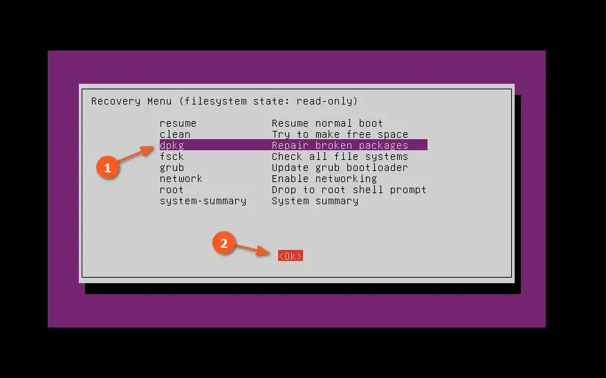 Теперь вы будете взаимодействовать с меню восстановления, в котором доступны различные опции. Вам нужно выбрать «dpkg: Восстановление поврежденных пакетов«. Для навигации используйте клавиши со стрелками, нажмите Tab, чтобы перейти к «Ok«, а затем нажмите Enter, чтобы подтвердить свой выбор.
