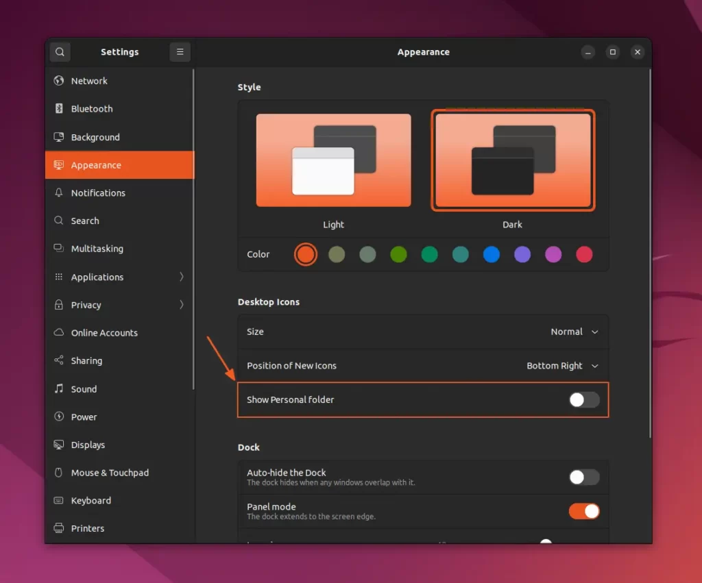 Включение/отключение значков на рабочем столе в Ubuntu 22.04