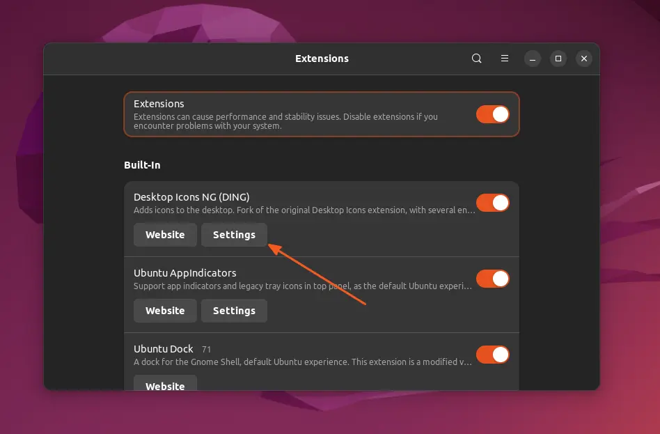 После завершения установки найдите и запустите «Расширения» в меню приложений, чтобы открыть экран расширений, на котором нужно перейти в раздел «Настройки значков на рабочем столе NG (DING)» в разделе «Встроенные».