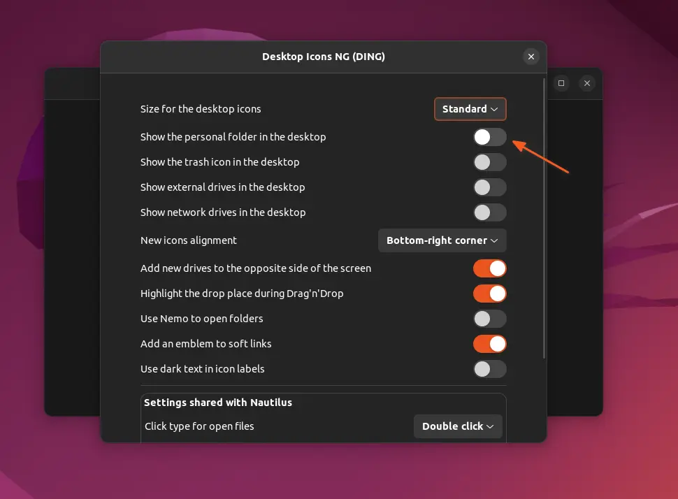 Отключите значки на рабочем столе Ubuntu 22.04, выполнив следующую команду: