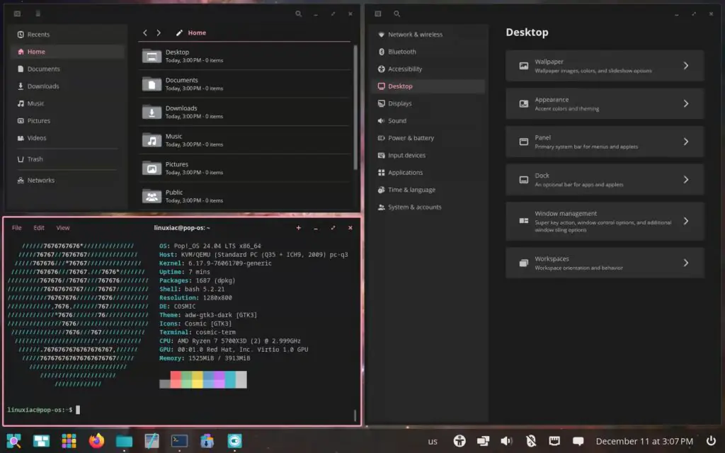 Наконец-то это произошло! У нас есть подарок на Рождество. Pop!_OS 24.04 LTS, созданная на базе ядра Linux 6.17 и Ubuntu 24.04 LTS, представляет собой первый стабильный выпуск среды рабочего стола COSMIC и завершает более чем трёхлетнюю разработку в System76.