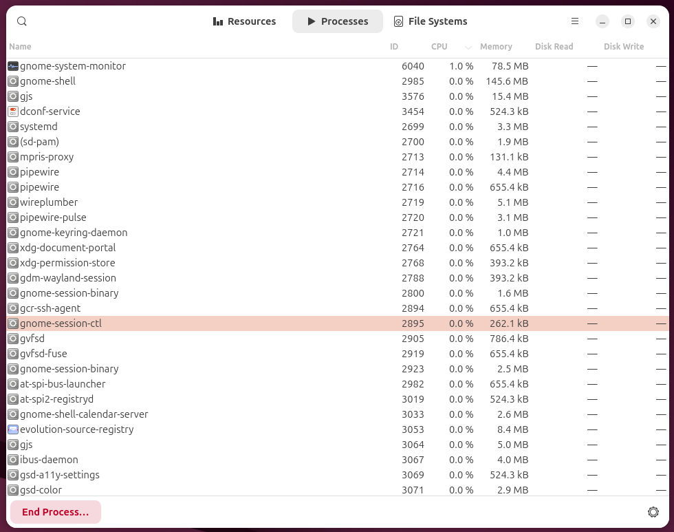 Системный монитор Ubuntu отображает информацию о процессах, ресурсах и файловых системах. В Ubuntu 25.04 интерфейс системного монитора Ubuntu немного изменился. Например, информация на вкладке «Процессы» ограничена следующими данными: идентификатор, процессор, память, запись на диск и чтение с диска. Вот интерфейс, в котором вы можете это увидеть.